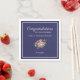 Bright and colourful botanical pink and navy blue watercolor garden floral on white "Congratulations on your engagement" custom paper napkin personalised with the names of the bride and groom and their wedding date or the date of their engagement party.