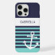 Simple contemporary ship anchor, on a classic and chic navy blue and light summery aqua turquoise colour stripes pattern. With room to personalise or customise with a name, initials or monogram of your choice on a white coloured background. Beautiful, modern, and cool cover for the trend-savvy and art-loving hip trendsetter, artsy motif lover who wants to protect their phone from dust and dirt, wear and tear. This design is available in Apple iPhone 6, 7, and 8 Plus, 10 or X, XR, XS, 11, 12, 13 Mini, 14, 15 Plus, and Pro Max cellphone cases. Show off your personal style, look fashionable trendy, and feel stylish with a unique design on a mobile device accessory of your choice.