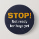Stylish navy blue button with a simple message that says STOP, NOT READY FOR HUGS YET in gamboge yellow and white typography. The white text is CUSTOMIZABLE, so you can create your own personal 'Keep Away' message! An ideal way to clear up the hug-or-elbow dilemma. Available in other colours.