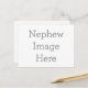 Keep in touch with your nephew by sending Zazzle custom postcards! Add your favourite image, photo, or artwork to a blank postcard, or simply say 'hi' by adapting a pre-existing design. It's also a good way to save paper, since you can send a note without wasting an envelope! Designing a one-of-a-kind postcard is a simple task, so click on 'Add Image' or 'Add Text' to try it out for yourself.