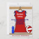 A unique design for the netball player or netball fan with a netball uniform hanging up in a sports changing room in red with blue and white trim. The name and netball position can be customised for the netball player. A netball and water bottle is next to the netball uniform. This personalised design can be created in any colour combination for the netball star in your family. Contact us through our GiftsBonanaza store with your request prior to purchase. sgb01