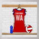 A unique design for the netball player or netball fan with a netball uniform hanging up in a sports changing room in red with blue and white trim. The name and netball position can be customised for the netball player. A netball and water bottle is next to the netball uniform. This personalised design can be created in any colour combination for the netball star in your family. Contact us through our GiftsBonanaza store with your request. sgb01