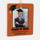 This custom orange senior graduate Christmas ornament features your graduation photograph underneath a black grad cap. Personalize with your class year, school, and name for a great gift for a graduating student.