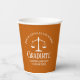 This custom orange law school graduation party paper cup features white typography for a class of 2024 graduate. Customise with your graduating year under the scales of justice for great personalised lawyer or attorney decor.