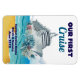 Custom small cruise cabin door magnet that can be repurposed as a fridge magnet keepsake after the trip. Design with a cruise illustration with flowers, the sea, sand, and the editable text "our first cruise" with the name of the ship, your names, and the date of the vacation.