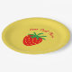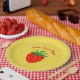 Custom paper party plate with red strawberry design. Cute party accessories with fruity print. Yellow green and red colours. Add your own personalised text. Great for kids Birthday, wedding, dinner party etc. Available in different sizes fro serving homemade cake, sweets, pastry food, desserts and more.