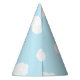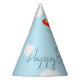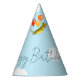 Custom Party Hat for a birthday party with a crocodile. Character for children's birthday party. Green cheerful crocodile flying through the blue sky with oblokas on coloured balloons. Blue coloured cone with the inscription Birthday!