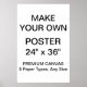 Custom printed personalised 24" x 36" PREMIUM CANVAS POSTER Blank Template. Design, create, make your own. Your photo, image, text, logo, graphics in edge-to-edge full colour print. PREMIUM CANVAS is made from an additive-free cotton-poly blend that is fade-resistant for 75 years and is recommended for photography or fine art and features special ink-receptive coating to protect printed surface from cracking when stretched. Best for college dorm and teenage bedroom decor, and for Christmas and birthday gifts.