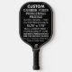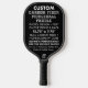 Design your own custom personalised Black Carbon Fibre Pro Pickleball Paddle Racket from a blank template, with Black custom background (change to any colour, design, photo). Available in black, white or tan handle and surround. Raise your game. Create your own personalised radical paddle and be at the vanguard of the Pickle Ball, Paddleball, Padel Tennis revolution, featuring great power and firm contact with the ball, and a smooth striking surface that will raise you to become an elite pickleball player. 16mm thick Carbon Fibre technology version, constructed of high-density polypropylene honeycomb core flanked by premium quality lightweight, strong and durable carbon fibre plates, a combination that reduces vibration and provides stable speed, resulting in optimal ball strike, for the most radical, professional play. Ultimate performance for the serious player. The tapered handle increases swing speed, fully wrapped with a solid non-slip grip for extreme traction. The paddle head size is 11" x 7.625", and with the handle measures a full 15.75" x 7.75". Available in black, white or tan handle and surround. Also available as an additional purchase are an Outdoor Pickleball Ball and a Protective Neoprene Racket Cover. Make your own fully customisable Pickleball bat by personalising both the front and the back of the racket with your photo, image, design, logo, plus add text. Did you know that the main difference between Pickleball and Paddle Ball is simply the size and material of the ball that is played with, along with the size of the court. Paddle Ball courts are larger than Pickleball courts, and the ball used in Paddle Ball is made of rubber, whereas the ball used in Pickleball is made of plastic that is perforated.