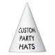 Custom printed personalised CONE PARTY HAT Blank Template - 6" high (assembled). Design, create, make your own. Vibrant full colour edge-to-edge print of your photo, pattern, image, text. Party hats have an elastic string attached to secure on your head. Minimum order of 12. Made in the USA.