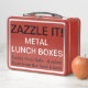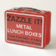 Custom printed personalised RED METAL LUNCH BOX Blank Template - 6.75” high x 8.625” wide x 3.75” deep, Weight: 12 oz. Design, create, make your own. Your photo, image, text, logo, graphics in full colour print on one side or on both sides of the lunchbox. Food contact safe interior material, durable - CPSIA complaint - tin plate, with collapsible black plastic handle. Choose from 6 base colours: White, Stainless, Black, Dark Blue, Light Blue & Red.