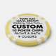 Custom personalised YELLOW Casino / Poker Chips. Set of 10 fun casino chips with an 'easy stack' textured surface. Choose from 9 colours of classic stripe on the poker chip edge: Red, Blue, Green, Black, Yellow, Pink, Orange, Light Blue and Grey, and customise the front, back and edge of your poker chips with a photo, picture, image or design, and add text, vividly printed on high quality composite plastic. Design, create, make your own casino chips from a template or blank. Add your logo and branding for business promotion, and makes a perfect favour gift for a wedding, or token for a birthday, sweet sixteen or bachelorette party, corporate celebration or other special event. A great customisable, personalised gift for Christmas or any occasion. Poker Chip Dimensions: 1.55" diameter x 0.125" thick.