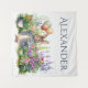 Peter the rabbit in his blue jacket holding colorful balloons in his flower garden with a white picket fence