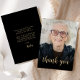 The front of this 90th birthday invitation features the guest of honour's photo with the words "thank you" in elegant gold-coloured calligraphy script overlay. A dark screen helps make the text pop. Customise the reverse side with your personal message in gold-coloured sans serif font and your name in script on a black background.