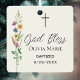 This floral Baptism photo keepsake ornament features wildflowers and a cross with stylish script typography on a soft cream background.