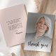 The front of this 70th birthday invitation features the guest of honour's photo with the words "thank you" in elegant black calligraphy script overlay. A white screen helps make the text pop. Customise the reverse side with your personal message in black sans serif font and your name in script on a blush pink background.