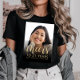 This 21st birthday party t-shirt features the guest of honour's photo with a gold-coloured text overlay. The word "cheers" appears in elegant gold-coloured calligraphy script, followed by "to 21 years" and the guest of honour's name and birthday in sans serif font. A dark screen helps make the text pop. A great way to celebrate someone who's turning 21!