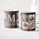 Create your own personalised 8 photo collage coffee mug with your custom images on a rustic farmhouse style wooden plank background. The design also features your monogram. Add your favourite photos, designs or artworks to create something really unique.