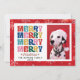 This is a fun and festive Christmas card with large, colourful letters that spell “MERRY” repeatedly in bold, playful font. Next to the bright text is a space where you can add your own picture—whether it's a family photo or your pet in a Santa hat. Underneath, there’s a spot to personalise the card with your family name and the year. The background is light blue with small white snowflakes, giving it a wintry feel. It’s a cheerful and easy-to-read design, perfect for sharing some holiday joy with a personal touch!