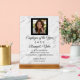 Elegant and simple award plaque including the recipient's photo! Customise this beautiful marble print pattern acrylic (glass-like) award plaque with any title, recipient, corporate business logo and details. Makes a great employee of the month or year, outstanding service, recognition, achievement, accomplishment, charity, volunteer or sports banquet award trophy. Custom personalised acrylic award block plaque is freestanding as a trophy and easily customised online. Clear with white marble print and full colour logo printing and black lettering, Great for business employee or any desired purpose.