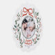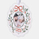Celebrate the holiday season with a Christmas card that doubles as a keepsake and a tree decoration. This unique round, scalloped ornament card features beautifully hand-painted holiday foliage in fresh, modern green and red watercolor tones, finished with a hand-drawn red bow at the top. In the center, a circle frame invites you to add your own family photo, creating a personal greeting that feels warm, stylish, and heartfelt.