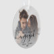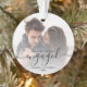 Commemorate your engagement with this beautiful modern keepsake ornament. The black text reads "Our first Christmas engaged," with the word "engaged" in elegant handwriting script with flourishes before and after. Replace the sample image with your favourite photo, and add your names and the year. A white gradient filter helps make the text pop.
