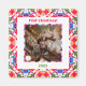 Custom Photo First Christmas Newly Weds New Home Magnet. A square photo fridge magnet to celebrate your happily ever after at Christmas. Replace the photo with your own. A square photo will work best. Edit the text using the Personalise button. A merry maximalist, geometric pattern design for Christmas. A newly married couple or someone moving into a new house will love being celebrated with this bright orange, warm red and pink, and traditional tree green and winter blue patterned magnet, with a picture of themselves celebrating. A budget friendly gift for a festive Christmas housewarming or a festive first anniversary.