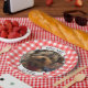 Customisable, personalised photo frame template with a red chequered buffalo plaid pattern background. Copyright © Angi Laframboise.