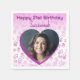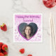 Make any special occasion fun with a heart shaped photo and message on a napkin with a purple linked heart pattern background. Replace the placeholder photograph with your photo. A square photo with subject centred within the square works best. Personalise the template fields, remove text or use the edit design tool to select a font style, size, and colour you prefer. The design can also serve for any birthday, graduation or bridal shower just to name a few special occasions.
