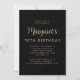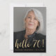 The front of this 70th birthday invitation features the guest of honour's photo with a gold-coloured text overlay. The phrase "hello 70!" appears in elegant gold-coloured calligraphy script, followed by the guest of honour's name and birthday in sans serif font. A dark screen helps make the text pop. Customise the reverse side with the name and party details on a black background. A great way to celebrate someone who's turning seventy!
