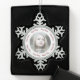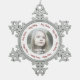 Custom Photo Pewter Snowflake Ornament. Create a beautiful snowflake shaped pewter Christmas tree ornament by adding your custom photo to make your holidays tree extra special. Solid pewter Christmas ornament features a white background frame with circular text that says "Merry Christmas * Happy Holidays" and is an excellent stocking stuffer! Make one for everyone in the family and keep as a holiday keepsake to grace the tree every year. Upload your photo into position and add your custom text.