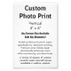 Custom Photo Print blank customisable, personalised custom print photo print template - 4" x 6" vertical (portrait) Kodak Professional Photo Paper (Satin) photo print, developed specifically for darkroom printing, Kodak photographic paper is a premium silver-halide photo paper that is designed to dramatically enhance your picture colours, while still maintaining a consistent tonal reproduction, all photo prints available in dozens of custom metal or colour toned wood frame options, (made in America with 100% Ash wood) and hand-fitted by a team of professional framers, with mat (mount, card frame) and frame glazing options available - for photo, image, text, or your own customised design creation. CUSTOM PHOTO PRINT (BULK BUY DISCOUNT PRODUCT) MULTI PURCHASE SAVINGS: 4 photos. (Save 10%) 51 photos. (Save 15%) 101 photos. (Save 20%) Note: Check the drop down options on Item Quantity 'Qty' button for current discounts on specific numbers ordered. Multi purchase savings refer to .com rates - discounts on multiple orders from other country specific Zazzle sites may differ or may not be available. All stated discounts are correct at time of input and are subject to change. ADD A STANDARD FRAME: Black Wood STANDARD FRAMES are made of 100% wood and are a very affordable finishing touch! Standard frames come ready-made in many standard sizes, and so are available only on standard size photo prints but not custom sizes, which will require your choice of wood or metal CUSTOM FRAME. Depending on the dimensions of your photo print, there may be options of mount, mat, card frame to surround your photo print within the frame. ADD A CUSTOM FRAME: Custom frames are hand-made by pro framers and are therefore available for any standard or custom size photo print. Featured in wood and metal styles, custom frames are a perfect complement to your art. Depending on the dimensions of your photo print, there may be options of a first and second mount, mat, card frame to surround your photo print within the frame. Your also have the option of Acrylic, Acrylic (Non-Glare) or Acrylic (UV-Protection) glaze applied to your choice of frame. CUSTOM FRAME GLAZING OPTIONS: ACRYLIC: The most basic type of glazing, this clear sheet of acrylic is firm enough to avoid bending in the frame. Standard acrylic glazing works to protect your image from dust and dirt, and is more impact-resistant than glass, so you don't have to worry if the picture falls down. It is perfect for use in children's rooms and in high-traffic areas of your home or office. ACRYLIC, NON-GLARE: Lightly etched to produce a surface pattern that diffuses reflections, non-glare acrylic glazing makes your artwork easier to view. With a matte finish, this glazing option can be useful when your art is placed in a brightly-lit area. ACRYLIC, UV-PROTECTION: Designed for conservation, acrylic glazing with UV-protection keeps your image from fading, yellowing, and brittling as a result of exposure to direct sunlight and artificial light. The best option for framing your museum quality fine art and photographs, UV-protection acrylic filters out the damaging UV-rays to make your art enjoyable for many years to come. CUSTOM WOOD FRAME COLOR & SIZE OPTIONS (some options may not be in stock): Cherry Frame (1 1/4") Honey Oak Frame (1 1/4") Country Honey Frame (1 1/2") Black Coffee Frame (1 1/8") Black Coffee Frame (1 1/2") Sunset Gold Frame (1 1/8") Whitewash Frame (1 1/4") Honey with Rope Frame (1 1/4") Gold Ornate Frame (1") Walnut with Rope Frame (1 1/4") Antique Silver Ornate Frame (1") Barnwood Olive Green Frame (1 1/2") Barnwood Mocha Frame (1 1/2") Satin Black Frame (1 3/8") Country Honey Frame (2") Sunset Gold Frame (2") Black Coffee Frame (2") Traditional White Frame (1 1/4") Rainbow White Frame (7/8") Rainbow Red Frame (7/8") Rainbow Green Frame (7/8") Rainbow Royal Blue Frame (7/8") Rainbow Canary Frame (7/8") Rainbow Orange Frame (7/8") Rainbow Lavender Frame (7/8") Rainbow Navy Blue Frame (7/8") Rainbow Black Frame (7/8") Sunset Gold Frame (1 1/2") Walnut Starflower Frame (7/8") Sunset Gold Frame (1 1/2") Bronze Scoop Frame (1 1/8") Charcoal Scoop Frame (1 1/8") Country Honey Frame (1 1/8") Country Honey Frame (1 1/2") Black Coffee Frame (1 1/2") Plum Ornate Frame (1 1/2") Tan Rustic Frame (1 1/4") Brown Rustic Frame (1 1/4") Black Rustic Frame (1 1/4") Gold Ornate Frame (1 1/2") Pewter Ornate Frame (1 1/2") Gold Ornate Frame (2") Antique Silver Ornate Frame (2") Walnut Two-Tone Frame (1") Honey Two-Tone Frame (1") Basic Black Frame (1 1/4") Basic Natural Frame (1 1/4") Basic Mahogany Frame (1 1/4") Basic Fruitwood Frame (1 1/4") Basic Black Frame (3/4") Basic Natural Frame (3/4") Basic Mahogany Frame (3/4") Basic Fruitwood Frame (3/4") Basic Walnut Frame (3/4") Matte Black Frame (1 3/4") Natural Frame (1 3/4") Mahogany Frame (1 3/4") Fruitwood Frame (1 3/4") Walnut Frame (1 3/4") Heavily Distressed Black Frame (1 1/2") Distressed Black Frame (1 1/2") Distressed Walnut Frame (1 1/2") CUSTOM METAL FRAME COLOR & SIZE OPTIONS (some options may not be in stock): Matte Black Metal Frame (7/16") Bright White Metal Frame (7/16") Mosaic Blue Metal Frame (7/16") Chinese Red Metal Frame (7/16") Anodic Black Metal Frame (7/16") Graphite Metal Frame (7/16") Frosted Walnut Metal Frame (7/16") Gold Metal Frame (7/16") Frosted Gold Metal Frame (7/16") Frosted Silver Metal Frame (7/16") Silver Metal Frame (7/16") Burnt Sienna Metal Frame (7/16") Matte Black Metal Frame (1 3/8") Brushed German Silver Metal Frame (1 3/8") Florentine Grey Metal Frame (1 3/8") Florentine Walnut Metal Frame (1 3/8") Black Metal Frame (1 3/8") Brushed Antique Gold Metal Frame (1 3/8") Brushed Satin Chocolate Metal Frame (1 3/8") CUSTOM FRAME MAT, MOUNT, CARD FRAME OPTIONS (In order from most popular): White Conservation Mat Antique White Conservation Mat Sand Conservation Mat Ivory Conservation Mat Buff Conservation Mat Yellow Conservation Mat Pink Conservation Mat Light Blue Conservation Mat Blac