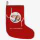 This Christmas Stocking is decorated with the word JOY in modern white typography on a red background