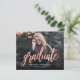 Modern graduation announcement featuring a custom horizontal photo. The word "graduate" appears in rose gold faux foil script, with the graduate's name, school, and year of graduation below in white sans serif font. Easily replace the sample image with your own graduate's photo. A black gradient screen helps ensure the text pops. The reverse is solid black. Ideal for high school or college graduation.