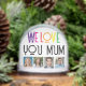 Show Mum just how much she means to you with this fun personalised Christmas photo snow globe, featuring the heartfelt phrase "We love you Mum" in vibrant rainbow text. Customise it with 5 of your favourite family photos to create a unique, sentimental keepsake she’ll treasure forever. This charming globe makes a perfect gift for Christmas, Mother's Day, birthdays, or any special occasion.