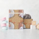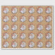 This Christmas gift wrapping paper features a graphic of a round tree ornament with a custom photo frame. The words "Merry Christmas" circle the outside of the photo frame. The background is light brown with white snowflake dots. Photography © Storytree Studios, Stanford, CA