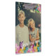 You can add your own photo and text to this product to personalise it. At the bottom side and top right corner there is a border of beautiful, animated flowers and butterflies framing the photo. The flowers are pink, yellow and blue with some green leaves. In the centre of the flowers there are pink or yellow green star shapes with a dot pattern. The butterflies are green, blue and pink.