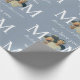 This custom mother's day gift wrapping paper features a sweet and sentimental photograph design on a dusty blue background. The phrase "we love you mum" is printed across the front of the card, with the "O" in "mum" replaced with a flower frame. A sample photo of children is placed inside which you can replace with a photo of your own kids. The names of the kids are printed below in an elegant script font.