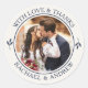 "With Love & Thanks" wedding stickers personalised with the couple's photo, and names. An elegant round template, with a traditional serif font, and leaf sprig motif. Perfect for weddings, bridal showers, and anniversaries — a stylish finishing touch to your wedding stationery, sealing envelopes or fastening ribbons, cards, and tags to party favours. Printed colours: very dark navy blue, and off-white, ivory cream. Shop the collection for matching stationery and supplies for sale online!