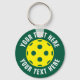 Custom pickleball sports keychain for picklers. Add your own personalised text like a player name, funny slogan, quote, pickler joke, saying etc. Cool sports Birthday party favour for men, women and kids. Custom key chains with pickleball ball logo design. Green and yellow or custom colours.