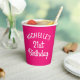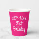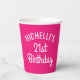 Custom pink 21st Birthday paper party cups. Disposable party supplies for twenty first Birthday party celebration. Elegant script typography template. Add your own personalised name. Custom colour. Double sided print.