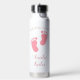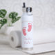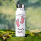 Celebrate the anticipation of a baby girl's arrival with this adorable personalised water bottle! Featuring pink baby footprints and the phrase “See You Soon,” this design includes custom text for a special aunt, grandma, or loved one. A heartwarming gift for pregnancy announcements, baby showers, or long-distance family.