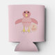This awesome can cooler features a cute cartoon of a pink chick. The chick has a pale pink belly and darker pink wings and head with a yellow beak and feet. Next to the chick is a small egg.