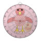 This awesome dart board features a cute cartoon of a pink chick. The chick has a pale pink belly and darker pink wings and head with a yellow beak and feet. Next to the chick is a small egg.