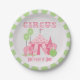 Kids who love elephants and the circus will love our Pink Circus Birthday paper plates as an addition to their birthday celebration! Features a pink big top tent with stripes and polka dots, two pink elephants, one in a party hat, green star birthday balloons, text that reads Circus, a green decorative border ring, and an area you can add the birthday girl's name and age!