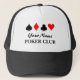 Custom poker club trucker hat gift for players. Cool gift for people who love playing poker, gambling and other card games. Four suits design with custom name. Personalise with your own unique name.