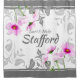 Brighten and personalise your bath with this elegant shower curtain in shades of grey. Dark bands edge the top and bottom with the large central expanse being white. The space is filled with leafy vines in various shades of grey and alternate corners feature arrangements of wispy pink cosmos flowers weaving their way through the grey blocks of colour . Add your first and last names in two deep coordinating grey hues. Perfect for your home decor or as a wedding gift for newlyweds or anniversary celebrations.