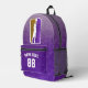 Show your love for the game with this customisable basketball backpack featuring bold purple and gold tones against a faux glitter background. The design centres around a dynamic silhouette of a basketball player going in for a layup, housed in a stylised cartouche shape on the main panel of the school bag. Add your name and jersey number for a personalised touch that’s perfect for players, fans, and coaches alike. Whether for game day, team banquets, or fan gear with flair, this backpack is a slam dunk for basketball lovers.