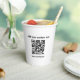 Custom white minimalist qr code paper printed coffee cup. Add and personalise with your own qr code, logo, brand, text, message, informations, website URL, url. Simple white paper cup personalised for weddings, business party, birthdays, marketing, promotion, shops, coffee, restaurant, contest, bar, event , corporate event, , fair trade, companies, business or personal use.