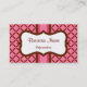A raspberry pink and chocolate brown pattern decorates this professional business card. Customise the information on this business card to suit your needs, add or delete information, change the font style, font size, etc...The design is from original art. Use this stylish business card for a spa, salon, small business, home decor, interior design, bed and breakfast, inn, coffee shop, event planner, bed and breakfast, boutique, bakery, coffee shop. chocolates, candy, daycare, child care, gourmet food, cosmetologist, etc...